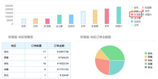 点击柱形图上的柱子时,通过使用超链接再次访问当前报表,同时将@legend/@category获取的当前所点击的柱子所在的系列值/分类值作为姓名参数值回传给报表。这样在展现报表时,地区销售表和地区订单金额图则会根据超链接所传递进来的不同姓名而变化。