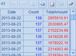 =A7.groups(Date;sum(Count):Count,sum(round(decimal(TotalAmount),2)):TotalAmount) |