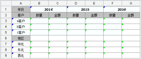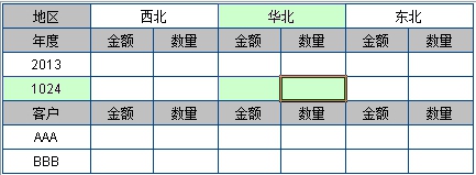 地区,年度,金额,数量组成一个序表,扩展后B1,A3,B3,C3单元格的值都是该序表的字段值;