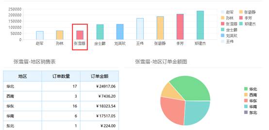 下图在柱状图中加入了图形/图例超链接,实现了在点击柱状图中的柱子图形时,会在本页面动态展现出所点击柱子代表的地区销售表和地区订单金额图;点击右侧的图例时,会在本页面动态展现出所点击图例代表的地区销售表和地区订单金额图: